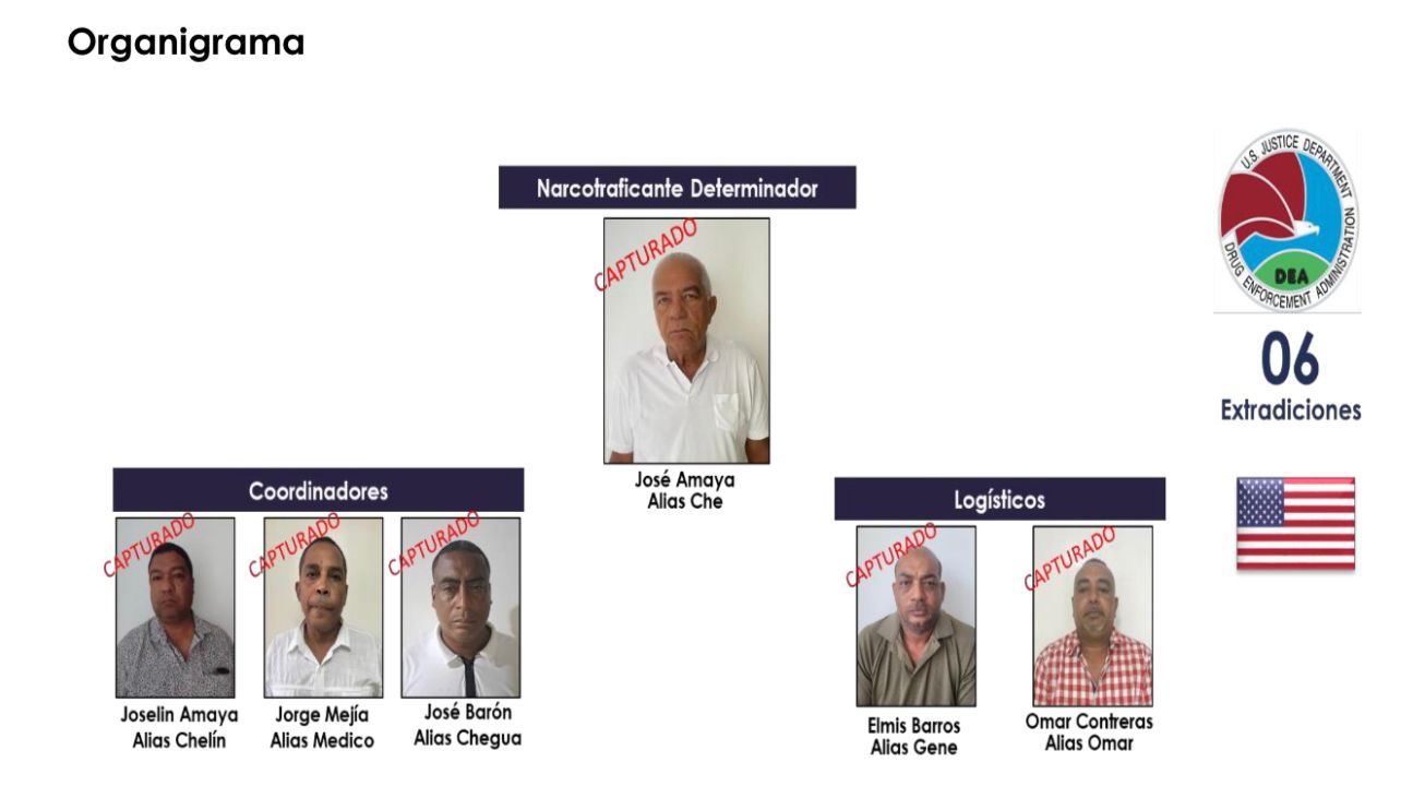 Entre los detenidos se encuentra José Nicolás Amaya Ramírez conocido con el alias de 'Che', líder de la organización narcotraficante, quien fungía como ganadero reconocido de la región junto con su hijo Joselyn Amaya Mejía alias 'Chelin', quien se encargaba de las reuniones y coordinaciones logísticas para el transporte de la cocaína hasta la Alta Guajira con destino hacia las Antillas Caribeñas y Centroamérica mediante lanchas rápidas.