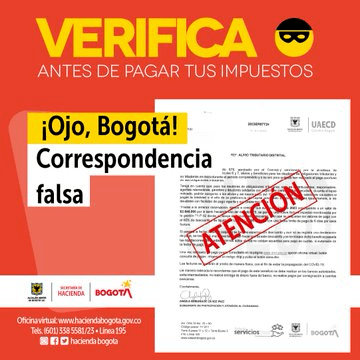 El objetivo es alertar a la ciudadanía sobre esta modalidad de estafa, que busca engañar a las personas con información parcial, pero que se puede confrontar directamente, confirmando cualquier dato o anuncio a través los canales oficiales de la Secretaría de Hacienda (https://www.haciendabogota.gov.co/es/canales-atencion).